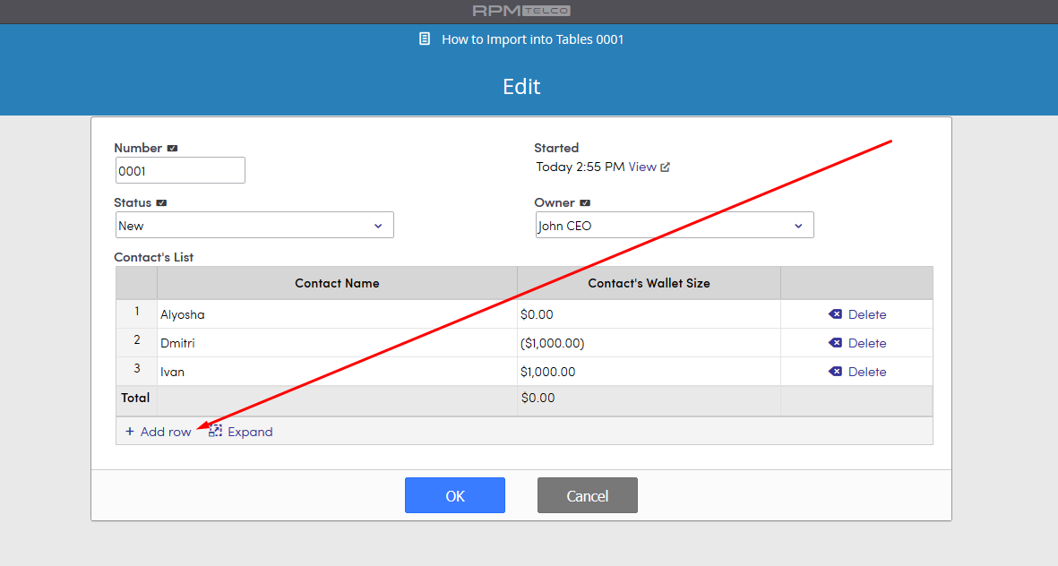 Table Row will be left blank if you would like to just create new rows in RPM sequentially starting from the top most row. To update existing rows of a Free Row Table you must have a corresponding number in the Table Row column that matches the Table Row you want to update.