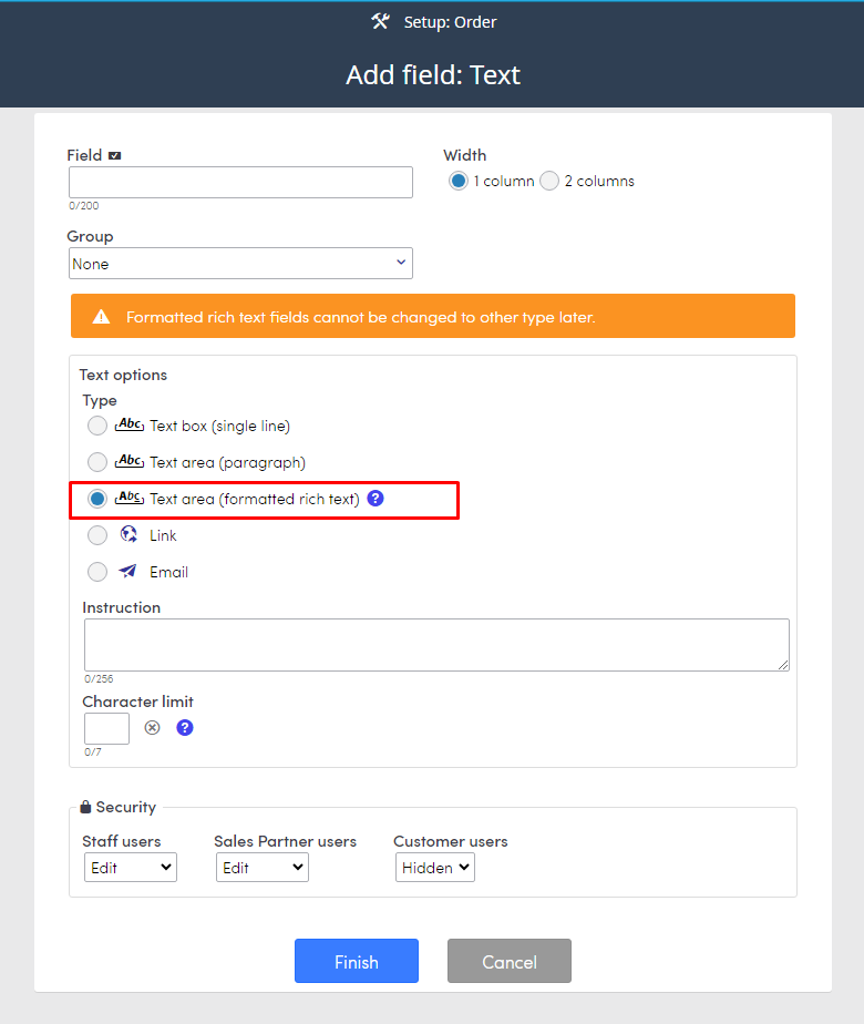- Type: There are five choices for Text fields: Text box, Text area, Text area (formatted rich text), Link, and Email.
